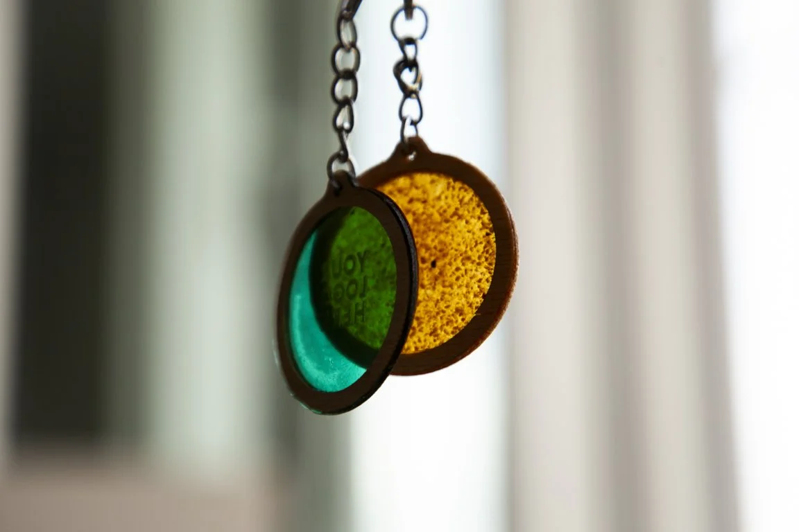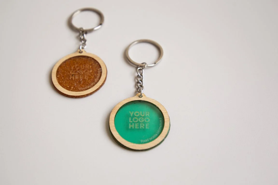 Un llavero marcado a láser. Material biodegradable con marco de madera. Cuando el b-material deje de ser útil, puedes tratarlo como un residuo orgánico.