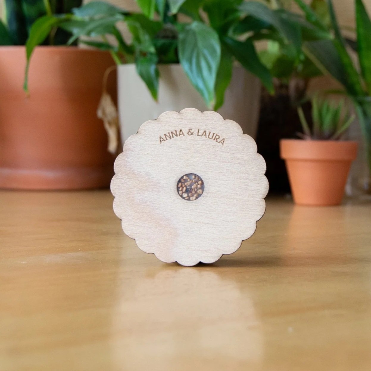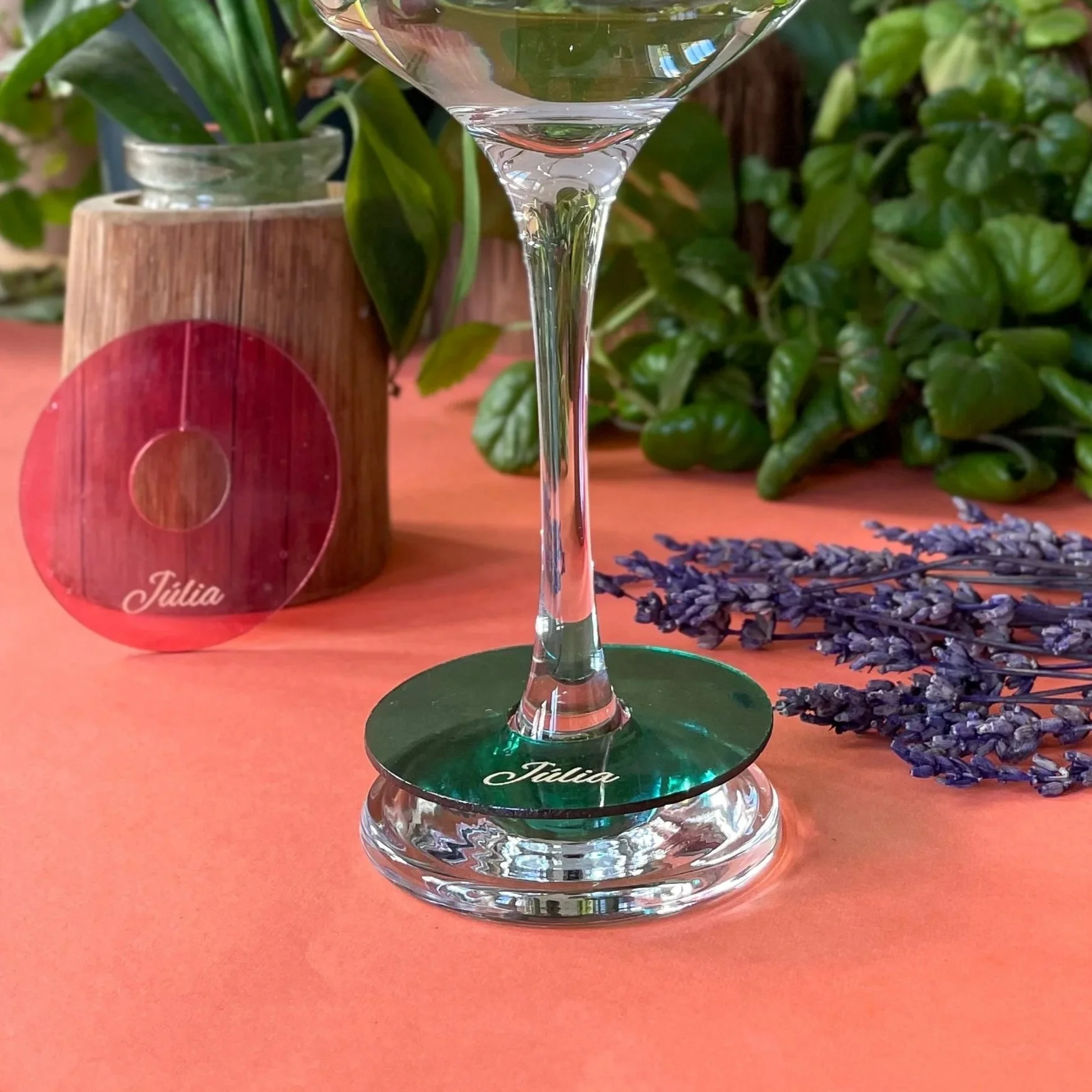 Identificadores personalizados en madera y biomateriales para evitar confusiones y añadir un toque de diseño a la mesa.