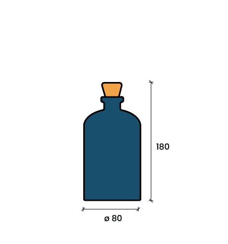 Botella de 500 mL realizada con vidrio biofotónico, que conserva las propiedades del contenido. Tapón de corcho. Exterior personalizable a todo color.