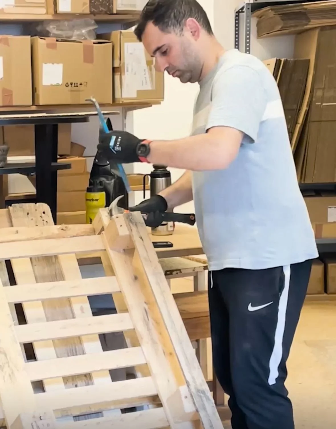 Se utilizan restos de palets de obra y maquinaria de corte láser.