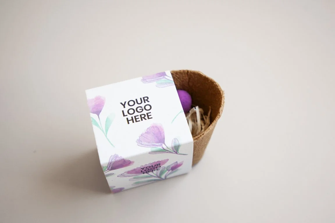 Un kit compuesto por una maceta de turba biodegradable, un disco de sustrato y una bomba o sobre de semillas. Todo ello envuelto en una faja de papel personalizada.