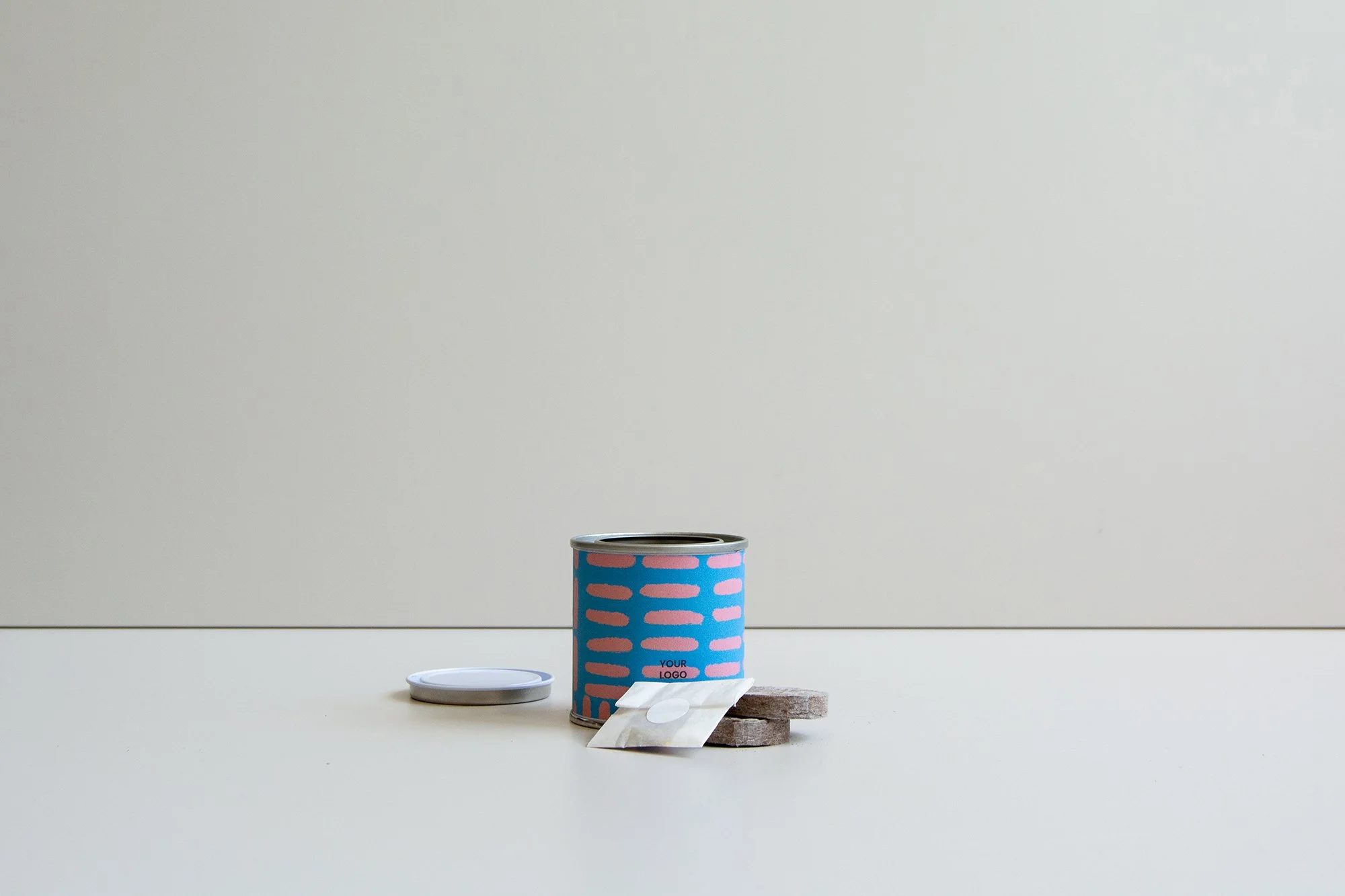 Un kit formado por un sobre de semillas y un disco de sustrato. La lata personalizable se transforma en la propia maceta.