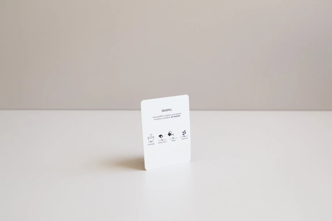 Una cápsula biodegradable con semillas y sustrato en su interior. Viene presentada en un blíster de cartón personalizable.